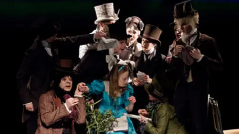 Очень часто инсценировщики, адаптирующие тексты Кэрролла для театра, объединяют «Страну Чудес» и «Зазеркалье». Мы пошли по другому пути: остановились на «Зазеркалье» — более сложной и строгой, «шахматной» истории, и постарались передать ее атмосферу. В сценической композиции Ивана Поповски можно встретить Белого Кролика, Черепаху Квази и Грифона из «Страны чудес», однако эти персонажи постановки входят в мир Зазеркалья и подчиняются его законам.